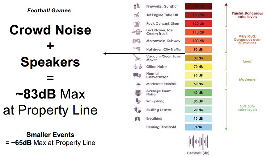 - Despite being exempt from the Village’s sound ordinance, Benet commissioned a sound study to ensure the system was appropriately designed and to determine the anticipated sound levels at the property line. Benet will conduct follow up testing upon installation of the sound system to confirm the sound projected is as designed.